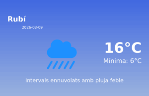 Previsió Meteorològica per a Rubí - 9 de març de 2026 Avui, a la ciutat de Rubí, experimentarem un dia predominantment plujós. Tingueu en compte...