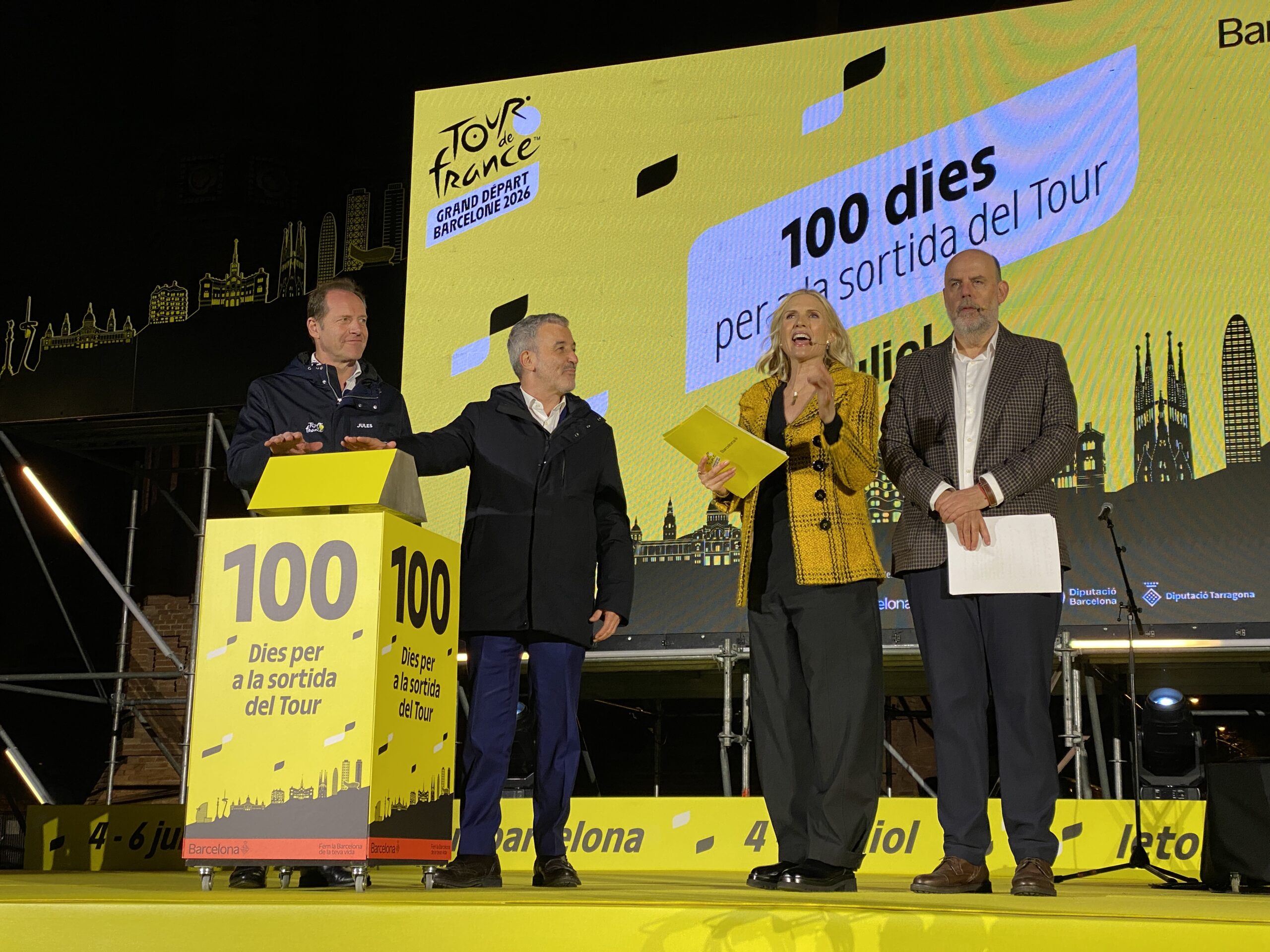 ACN Barcelona – Barcelona ha encetat aquest dijous el compte enrere definitiu cap al Grand Départ del Tour de França 2026. Per commemorar els 100 dies per a l’inici de la cursa ciclista, la capital catalana ha preparat una acció “de gran impacte visual” i una jornada festiva. L’epicentre de la celebració ha estat el passeig Lluís Companys, amb una festa amb un ventall d’activitats vinculades a la bicicleta i dirigides a un públic familiar. Judit Mascó i Jordi Basté han conduït l’acte oficial, que ha homenatjat els clubs ciclistes de la ciutat, i la cloenda ha estat l’inici del compte enrere, amb la il·luminació d’una setantena d’edificis icònics amb color groc i amb l’estrena de l’himne oficial del Grand Depart, la cançó de Doctor Prats ‘Energia!’.