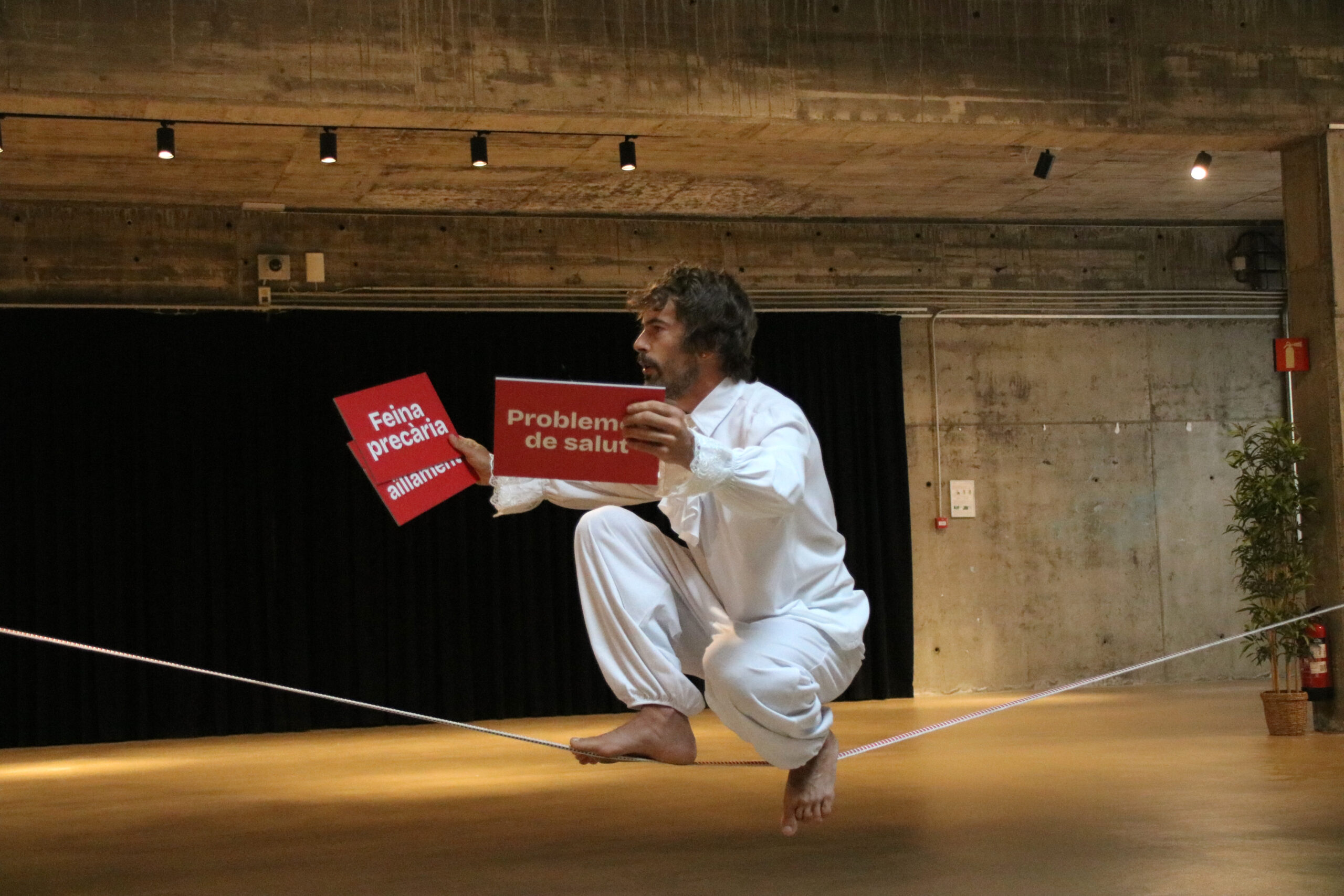 Per escenificar aquesta situació, Càritas ha preparat una acció visual amb l’actuació d’un funambulista. L’artista ha fet equilibris sobre una corda mentre diverses persones li entregaven cartolines on es podia llegir: ‘Feina precària’, ‘problemes de salut’ i ‘lloguer i subministraments’, entre d’altres. Es tracta d’evidenciar “la corda fluixa” a la qual es troben les famílies i les càrregues que assumeixen aquelles en exclusió social.