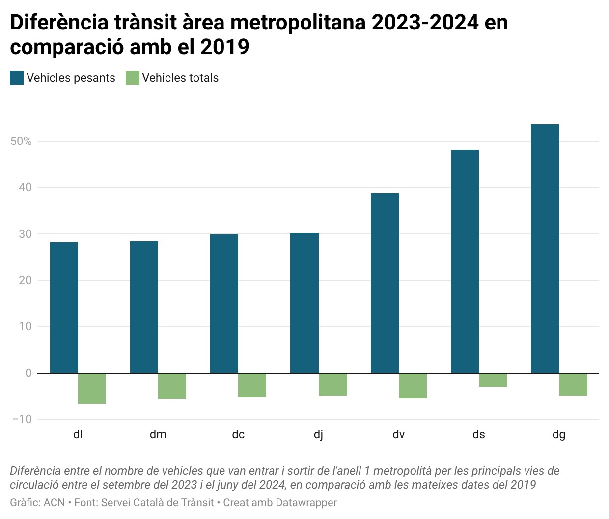 El director del Servei Català de Trànsit (SCT), Ramon Lamiel, ha explicat que des de fa alguns anys monitoren amb detall l’anell metropolità, el conjunt de vies ràpides i autovies que envolten Barcelona. Ha detallat que disposen d’un seguit d’estacions ubicades a vies d’entrada i sortida de la capital catalana, a uns 10-15 quilòmetres, que compten els vehicles que hi circulen. Segons Lamiel, les dades han revelat “un decrement d’entre un 5 i un 6%, a vegades més, fins i tot més d’un 6%”, entre 2019 i 2024, tant en les entrades com en les sortides. Com s’observa al gràfic, la reducció és generalitzada tots els dies de la setmana, de dilluns a divendres i també els caps de setmana, pel que fa al conjunt de vehicles. En canvi, els vehicles pesants han anat notablement a l’alça.