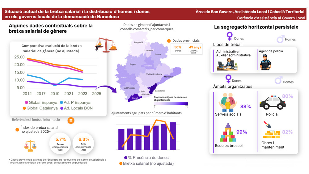 Segons l’estudi, el 56% dels llocs de treball als ajuntaments i consells comarcals estan ocupats per dones, amb una mitjana d’edat de 49 anys. Quan es segmenten les dades per comarques, el Barcelonès i el Garraf presenten els percentatges més alts de dones treballant a l’administració local, mentre que el Berguedà i el Baix Llobregat són els menys favorables.