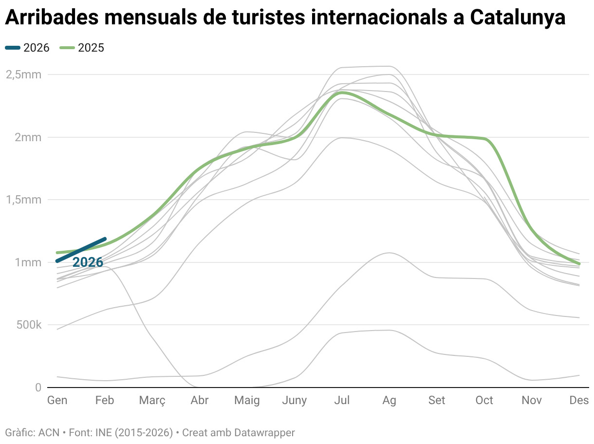 Al conjunt de l’Estat, al febrer van arribar 5,6 milions de turistes internacionals, un 2,8% més que en el mateix mes de 2025. Entre gener i febrer la xifra de visitants estrangers ha augmentat un 2% anual i frega els 10,7 milions de persones.