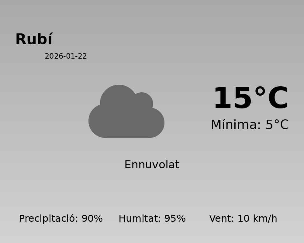 Avui, la situació meteorològica a Rubí es presenta marcada per un cel majoritàriament cobert i una elevada probabilitat de precipitacions. Amb un 90% de possibilitats de pluja, es recomana portar paraigua i impermeable si heu de sortir al carrer.