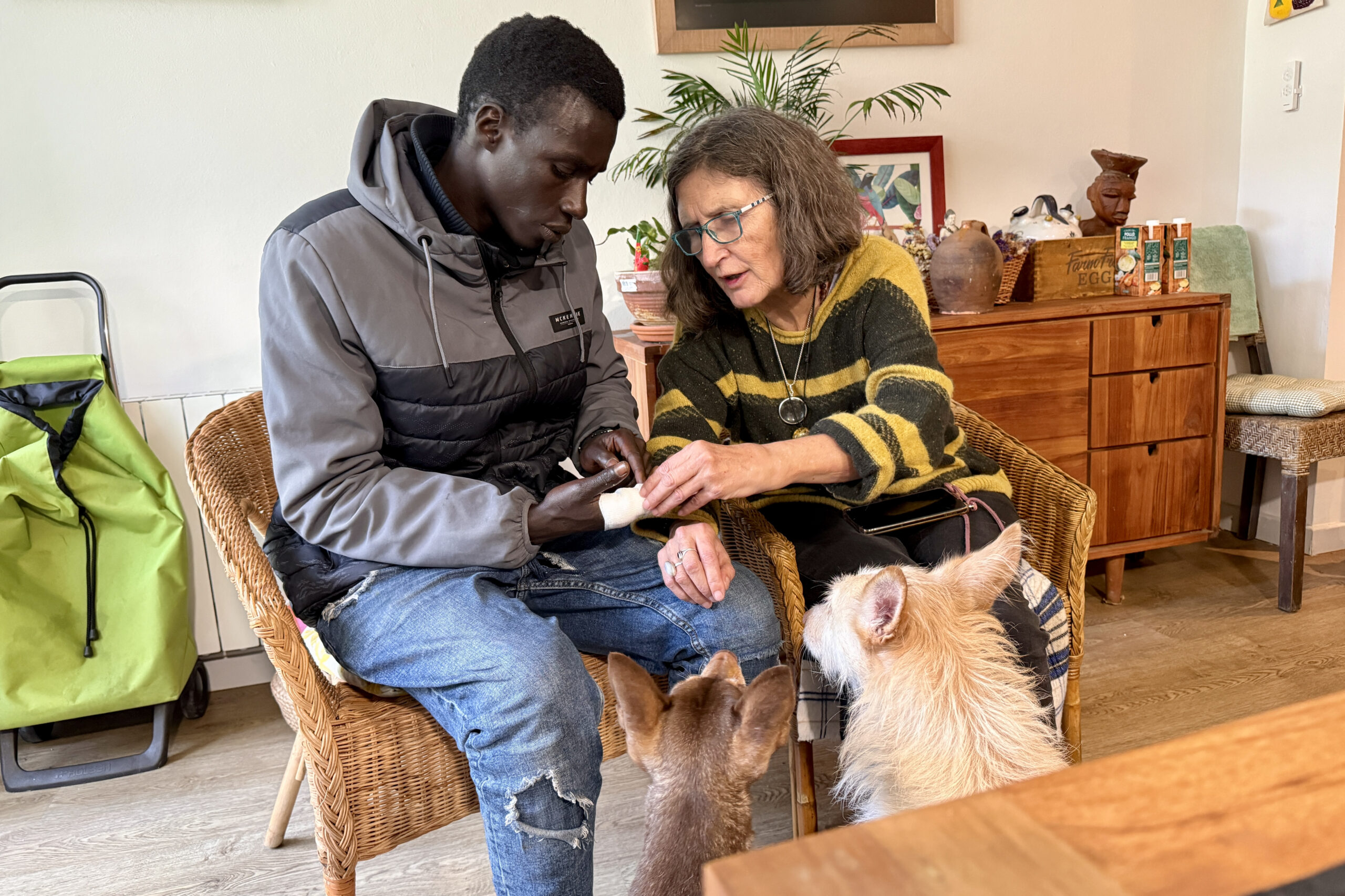 En aquell moment va aparèixer també l’Abdou, demanant ajuda per curar-se la ferida, que se li estava infectant i li havia provocat fins i tot febres altes. “No el podia deixar allà”, relata. Aquell dijous al vespre tots dos van fer nit a casa de l’Àngela de manera “totalment improvisada”. I s’hi ha estat fins dissabte.